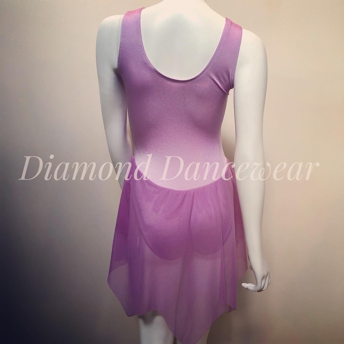Lovely lilac and mauve lyrical dance costume with mesh skirt and front drape. Features motif and crystal detailing on front bodice. Girls 10 in stock ready to ship